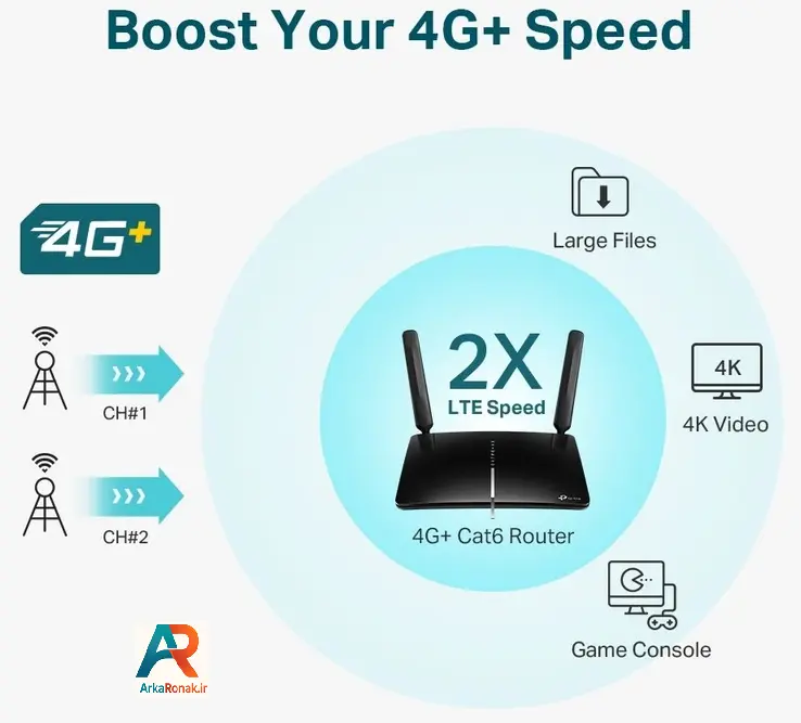 فعالیت در ۲ حالت روتر ۳G/۴G و روتر بیسیم دارای ۳ عدد پورت LAN از نوع ۱۰۰۰ / ۱۰۰ / ۱۰ مگابیت بر ثانیه دارای ۱ عدد پورت LAN/WAN از نوع ۱۰۰۰ / ۱۰۰ / ۱۰ مگابیت بر ثانیه دارای قابلیتهای مدیریتی Access Control, Local Management, Remote Management, reboot schedule دارای قابلیت Virtual Server, Port Triggering, UPnP, DMZ پشتیبانی از پروتکلهای IPv۴ و IPv۶ امکان ایجاد شبکه کاربری مهمان در دو حالت ۲.۴ گیگاهرتز و ۵ گیگاهرتز ۴G+ Cat۶ Up to ۳۰۰ Mbps