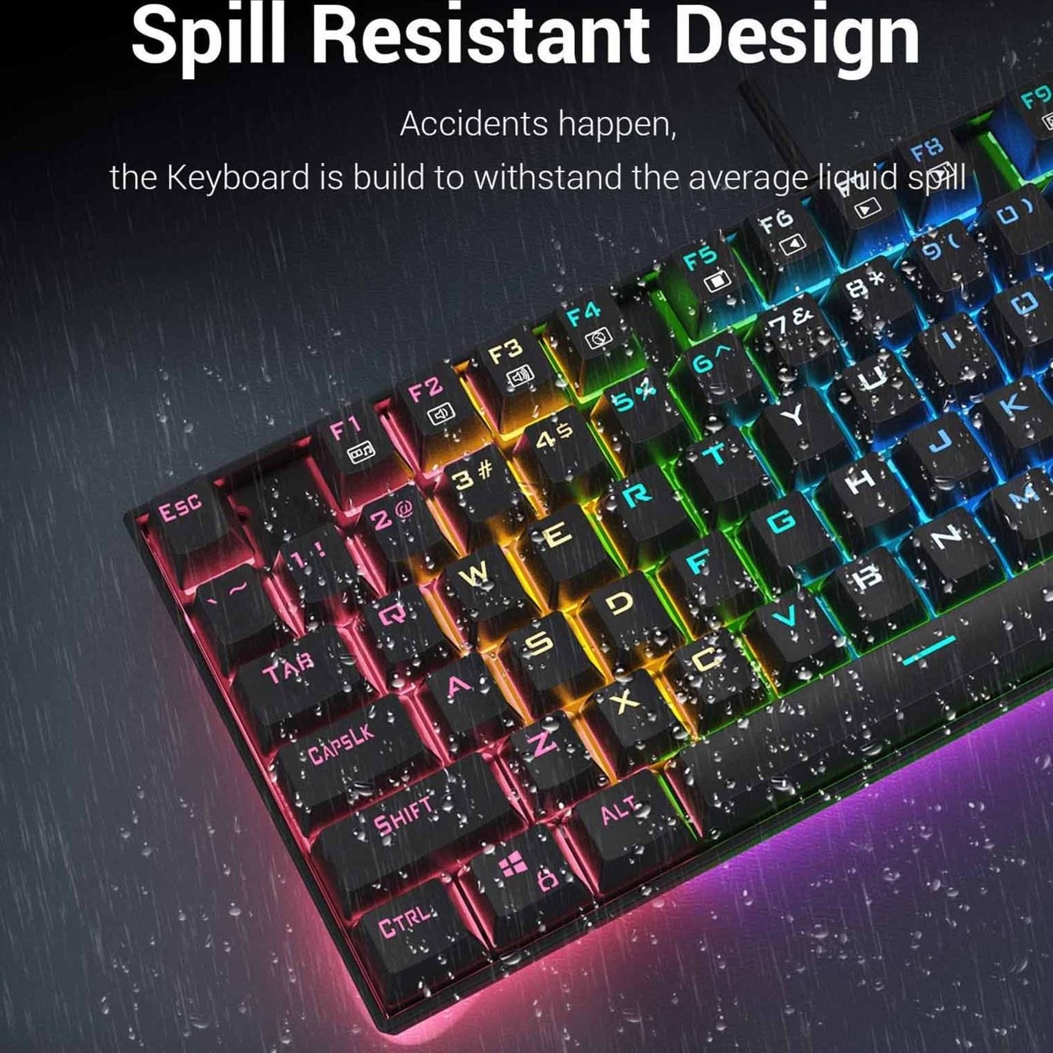 دسترسی آسان به 12 عملکرد چند رسانه ای و اینترنتی از طریق کلید FN, |, اتصال USB داری روکش طلا می باشد, |, قابلیت تغییر رنگ RGB به 5 حالت مختلف, |, استفاده از فناوری های Rollover, |, دارای محفظه خروج آب در زیر کیبورد, |, قابلیت قفل کردن کلید Win, |, عملکرد بدون تداخل Non-Conflict, |, دارای کلیدهای تزریق دو شات, |, حروف فارسی حک شده